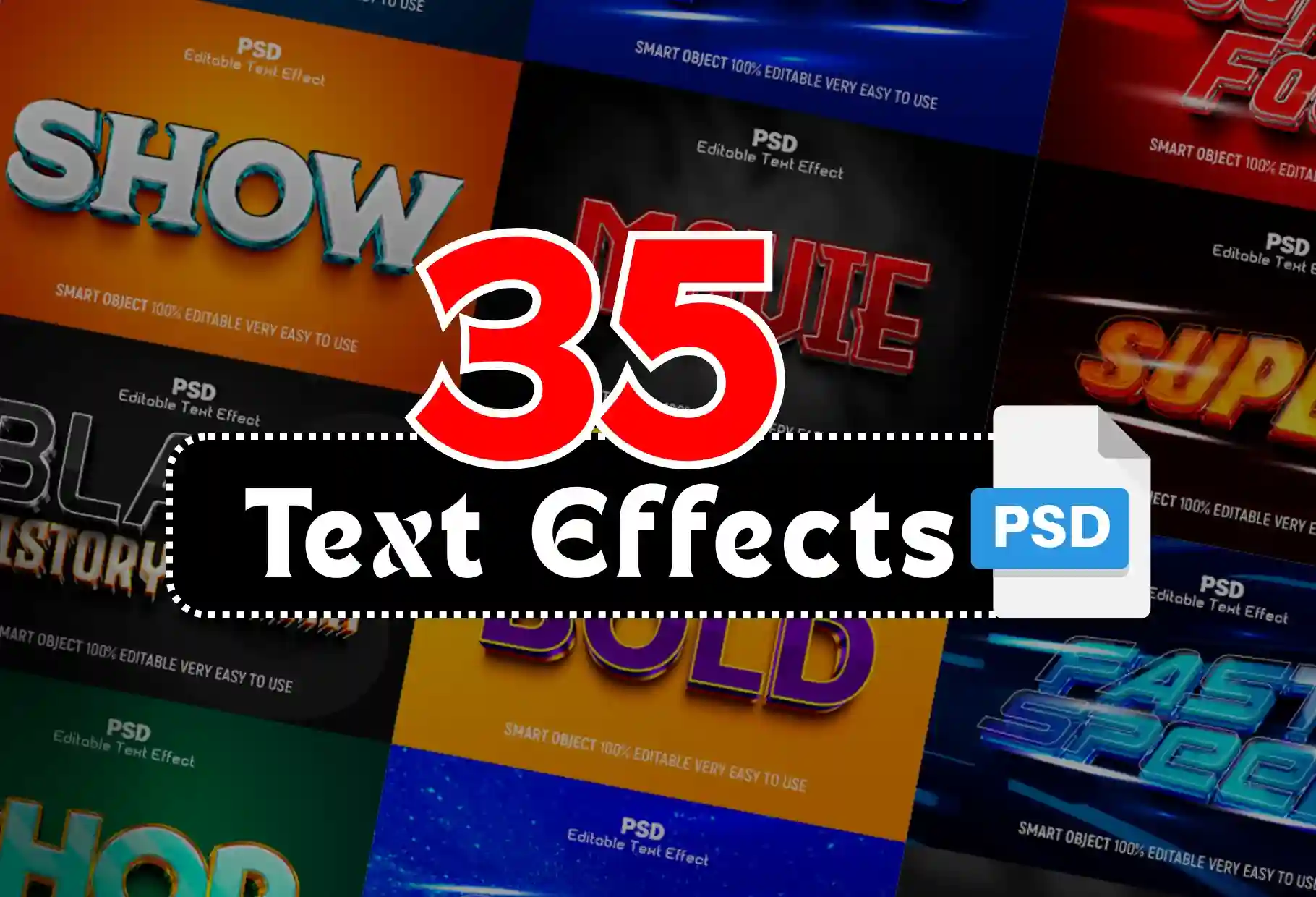 Download a premium collection of 35 editable text effects in PSD format designed to instantly transform your typography. Perfect for posters, flyers, social media, logos, and more. Easy to use with smart object layers in Photoshop.